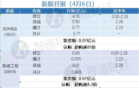 智通财经APP获悉,亚洲速运(08620)和新威工程(08616)正在招股中,截至4月6日,辉立、耀才以及信诚分别为其借出0.07亿元和0.07亿元,孖展分别超额认购81倍和8.2倍。