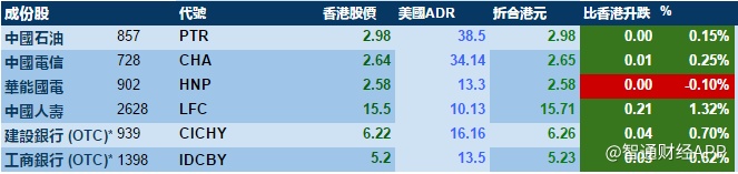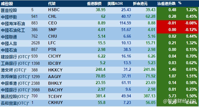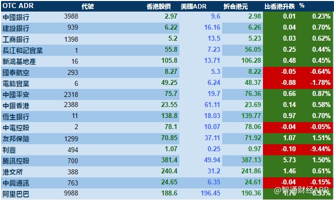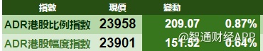 智通财经APP获悉,美股大幅反弹,刺激港股ADR指数全日向好,按比例计算,收报23958点,升209点或0.87%。
