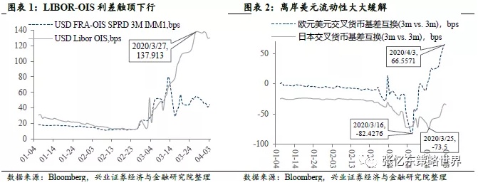 离岸“美元慌”明显缓解,特别是主要发达国家的美元荒已经基本平复。此前欧元、日元美元交叉货币互换基差持续恶化,而最近在3月16日欧元美元交叉货币互换基差达到近一年以来的极低值点-82.4 bp后一路极速上行,截至4月3日已达到历史高点+66.56bp;日元美元交叉货币互换基差在3月25日达到近一年极低点-73.5bp后持续收窄,截至4月3日降回-34.5bp,接近公共卫生事件前水平。