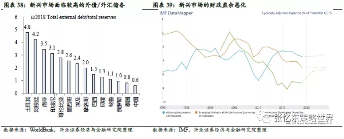 第四,新兴市场外债规模相比于其外汇储备较大。截至2018年,根据世界银行数据,土耳其、阿根廷、南非的外债/外汇储备分别为4.8、4.2和3.5。由于外汇储备不足,所以,我们看到南非已经出现了主权债务违约风险。