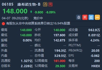 以每股142-146元,减持410万股,相当于接近发行股份3.1%,套现5.8-5.99亿港元,配售价较上周五收盘价157.6元,折让7.36-9.9%。截至发稿,康希诺生物低开6.09%,报148港元,成交额8.03亿港元。