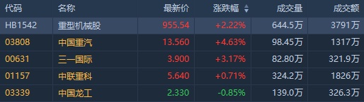 截至发稿,中国重汽(03808)涨4.63%,报13.56港元;三一国际(00631)涨3.17%,报3.9港元;中联重科(01157)涨0.71%,报5.64港元。