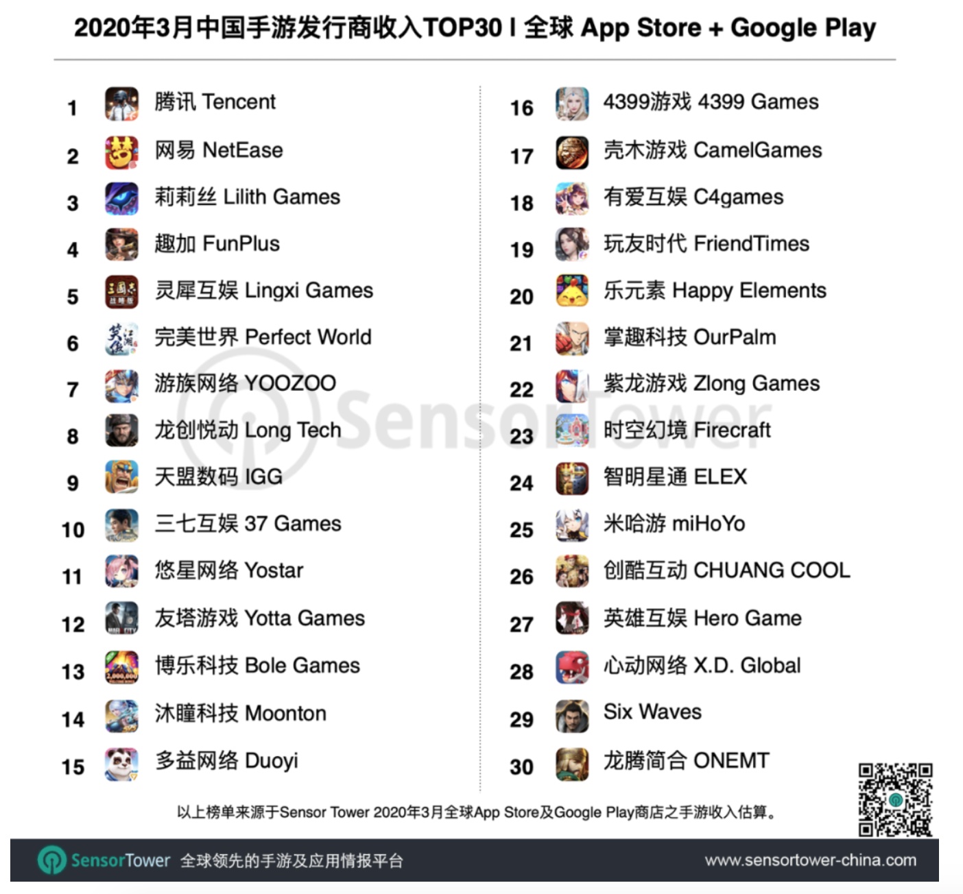 Sensor Tower商店情报平台显示,2020年3月中国手游发行商在全球App Store和Google Play的收入排名。榜单中30个手游发行商3月全球吸金超过16.3亿美元,占当期全球手游总收入27.6%。