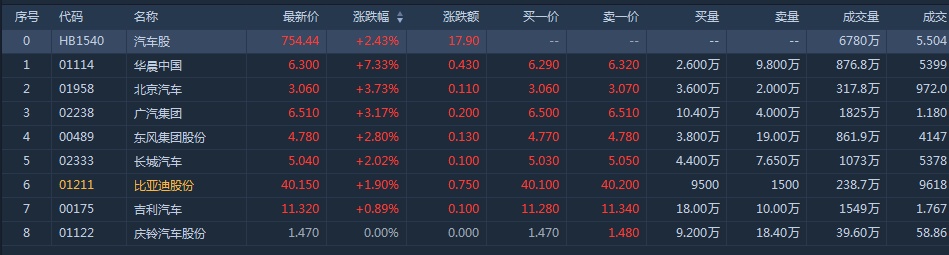 智通财经APP获悉,今日汽车股集体走高,截至10:34分,华晨中国(01114)上涨7.33%至6.3港元领涨汽车板块,北京汽车(01958)上涨3.73%至3.06港元,广汽集团(02238)上涨3.17%至6.51港元,东风集团股份(00489)、长城汽车(02333)上涨超2%,比亚迪股份(01211)上涨1.9%至40.15港元,吉利汽车(00175)上涨0.89%至11.32港元。