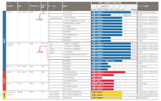 从整体研发管线来看,目前公司的研发管线拥有20多个药物开发项目,其中10个抗体处于临床阶段,6个双特异性抗体及4个抗体获得FDA的IND批准。其中靶向PD-1/CTLA-4的双抗药物AK104和PD-1单抗药物penpulimab(AK105)已进入到了II/III期关键性临床试验阶段,公司预计将于2021年下半年在中国提交AK104治疗子宫颈癌的首次NDA。
