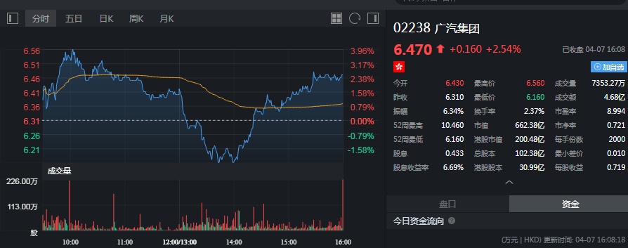 截至今日收盘,广汽集团涨2.54%,报6.47港元。
