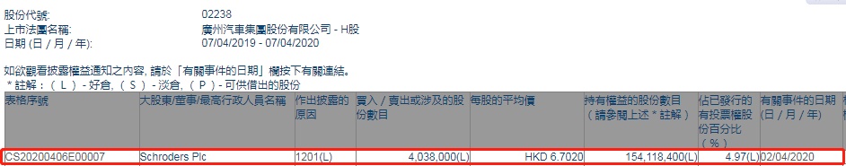 智通财经APP获悉,联交所最新资料显示,4月2日,Schroders Plc减持广汽集团(02238)403.8万股,每股作价6.702港元,总金额为2706.27万港元。减持后最新持股数目约为1.54亿股,最新持股比例为4.97%。