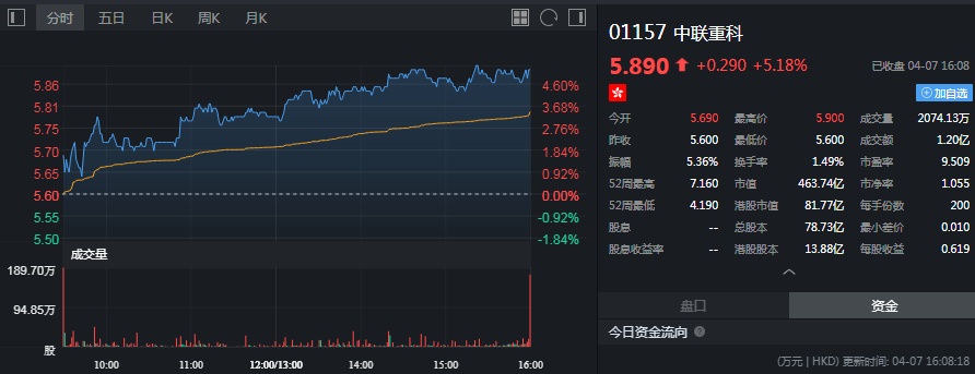 截至今日收盘,中联重科涨5.18%,报5.89港元。