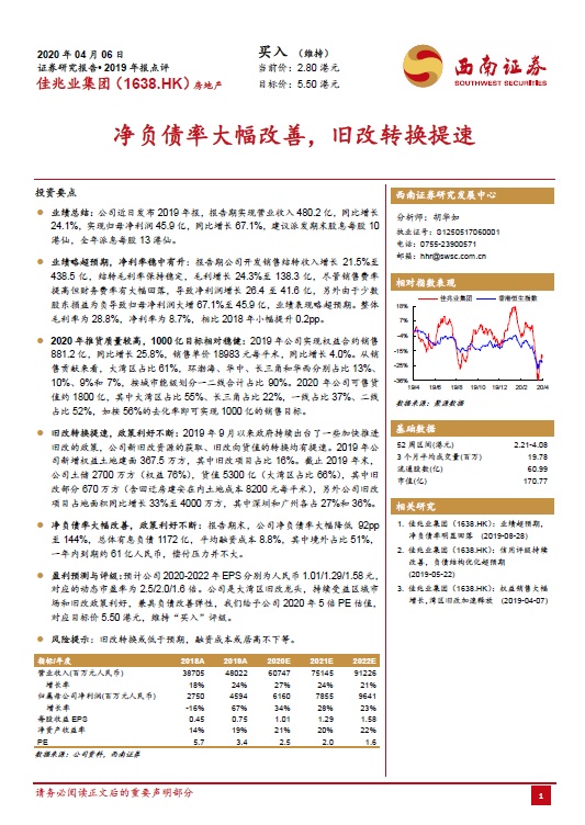 研报认为,公司是大湾区旧改龙头,持续受益区域市场和旧改政策利好,兼具负债改善弹性,给予公司2020年5倍PE估值, 对应目标价5.50港元,维持“买入”评级。