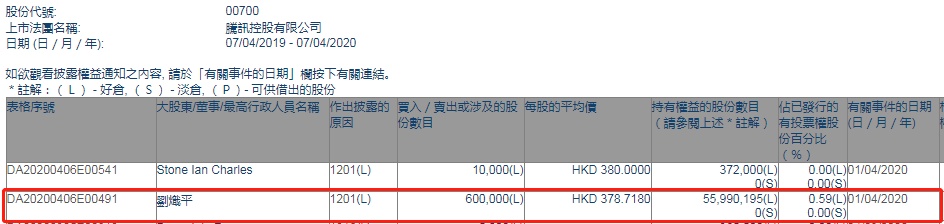 智通财经APP获悉,联交所最新资料显示,4月1日,腾讯控股总裁刘炽平减持腾讯(00700)60万股,每股作价378.7180港元,总金额约为2.27亿港元。减持后最新持股数目约为5599.02万股,最新持股比例仍为0.59%。