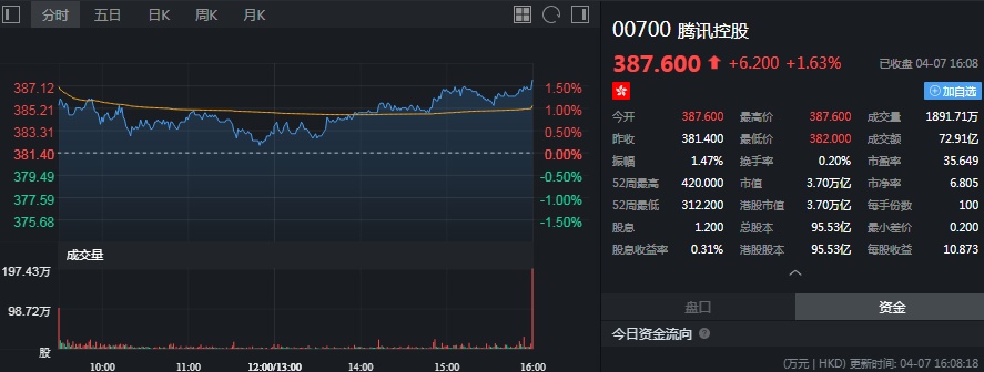 截至今日收盘,腾讯涨1.63%,报387.60港元。
