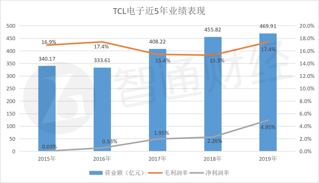 据TCL电子近期发布的2019年业绩报告,公司营业额同比增长3.1%至469.9亿港元(单位下同)再创历史新高;毛利同比增长17.5%至81.7亿元;得益于产品结构优化,毛利率同比提升2.1个百分点至17.4%。