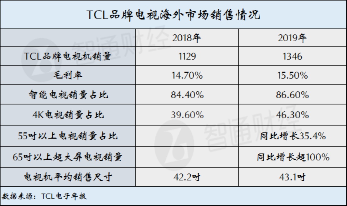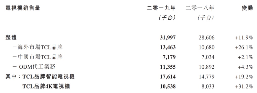2019年TCL品牌电视海外销售量同比提升26.1%至1346万台,销量占比提升4.8个百分点至42.1%;营业额达210亿元,同比增长14.1%;毛利率同比提升0.8个百分点至15.5%;经营业绩同比提升42.3%至8.8亿元。
