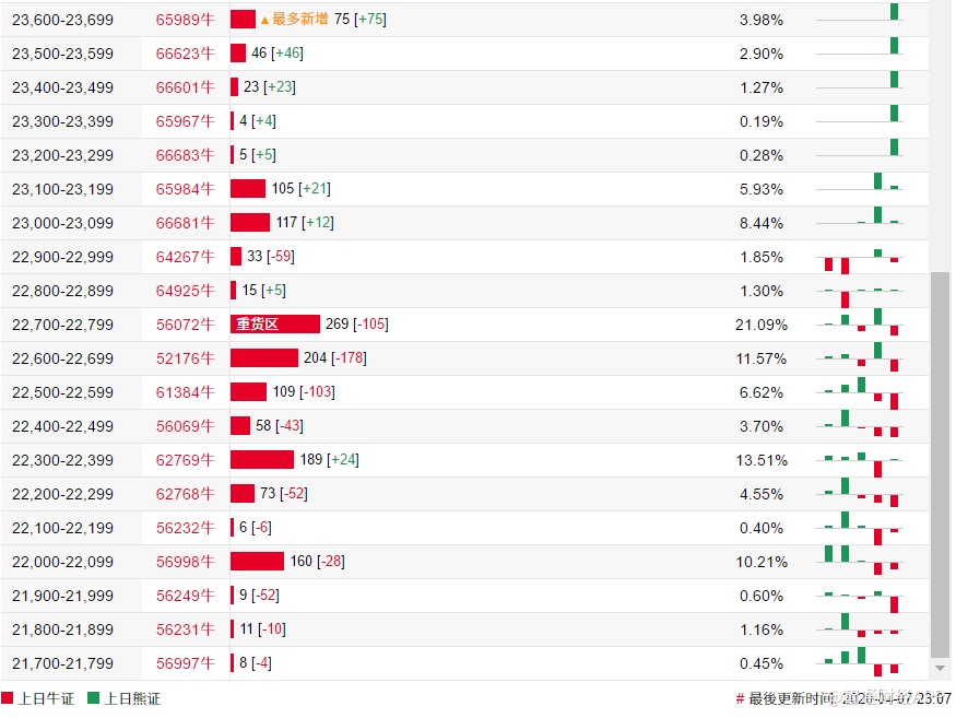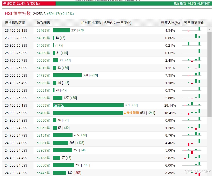 智通财经APP获悉,截至4月8日,恒指最新的牛熊街货比例25.4:74.6。法兴恒指牛熊证街货分布图中的数据显示,熊证街货重货区在25100-25199区间,该区间最新熊证数量为961张,较上一交易日增加63张,最多新增在25000-25099区间,新增244张。牛证街货重货区在22700-22799区间,该区间最新牛证数量为269张,较上一交易日减少105张,最多新增在23600-23699区间,新增75张。