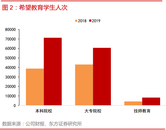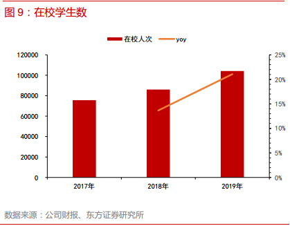 在客单价维度,由于新并购学校收费计算过程中的权重问题,较2018年略有下降。2019年公司收入学费及住宿费共11.95亿元,平均每名学生的学费及住宿费为11059元,较2018年同比减少4.8%。而是从各类学校来看,学费都有明显的提升,本科学生平均12000-19800元,专科学生平均5000-15000元,技师学生平均5000-9800元。20财年由于公共卫生事件影响,考虑到国家政策大方向,客单价将相对稳定(报表调整后权重因素将消失)。