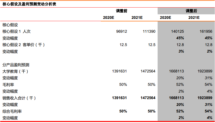 1) 公司内生和外延布局进展迅速,新并购院校已经并表,我们提升公司人次增速,预计20-22分别增长62.9%/15.6%/13.2%;预计20/21财年公司人均收入保持稳定在1.28/1.28万元,22财年小幅提升达到1.3万元。