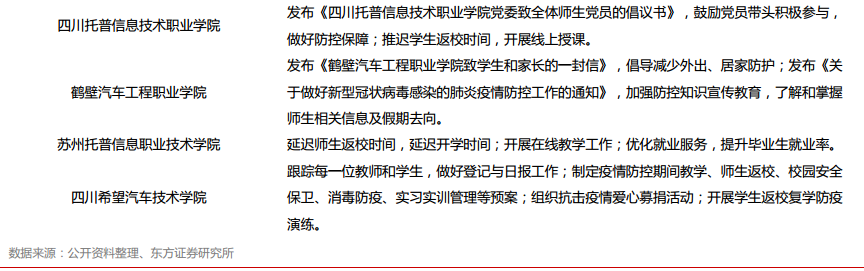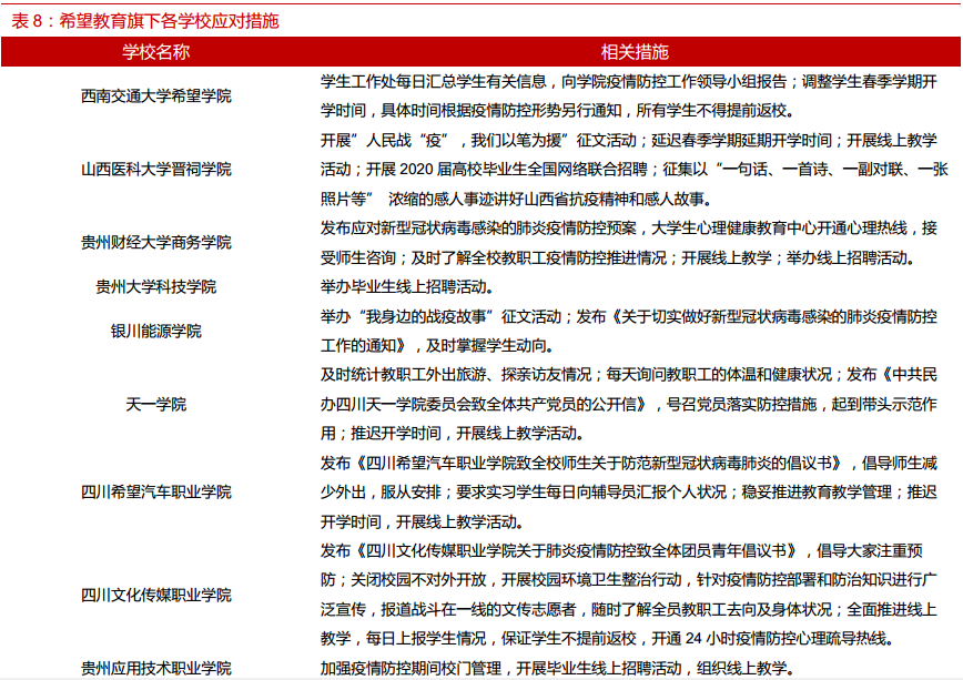 经受住公共卫生事件考验,稳妥开展春季学期工作。在卫生事件期间,希望教育旗下各学校一方面积极开展相关措施加强师生的防控工作,如每日统计师生的健康信息、外出情况,积极组织捐款,开展征文、故事收集活动宣传抗疫精神,并且推迟师生返校时间,有序开展在线教学活动;另一方面逐步推进毕业生就业工作,通过线上招聘会等形式努力提高毕业生签约率。目前各学校已有序开始在线授课活动,学校工作稳步推进。