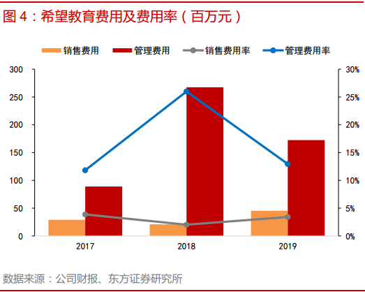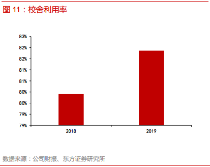 产能提升拉升毛利,费用率回归常态。在成本端,公司2019年销售成本为6.57亿元,同比增加16.8%,主要原因为一方面学生人数增加导致教师、教学设施投入增加;另一方面新收购学校并入报表导致成本增加。2019年公司实现毛利率50.7%,较2018年增加5.3%,毛利率上升主要是产能利用率提升的带动作用。产能利用率从80%提升到82%,一方面得益于原有校区的内生增长,原校区毛利率从45.4%提升至51%;另一方面新并购企业保持良好的经营态势,毛利率在46.4%。在费用端,销售费用率小幅提升1.4%至3.4%,前期上市开支和股权支付减少,管理费用恢复常态,下降13%至12.9%。