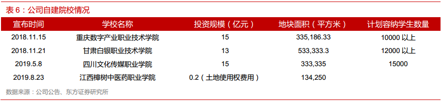 收购国内地块,加快校区建设。2018年11月,公司先后与重庆市忠县人民政府、甘肃省白银市白银区人民政府及白银市经济合作局签署项目投资协议,决定建设并运营重庆数字产业职业技术学院、甘肃白银职业技术学院。2019年5月,公司宣布与四川省简阳市人民政府签订投资建设四川文化传媒职业学院整体迁建(筹建本科学院)的项目投资协议。2019年8月,公司全资子公司樟树市育德教育管理有限公司与江西省樟树市人民政府订立土地使用权收购协议,拟建设江西樟树中医药职业学院。根据公司2019年业绩公告,2019年公司先后启动重庆数字产业职业技术学院、江西樟树中医药职业学院、甘肃白银职业技术学院3所院校的建设。三所院校建成后,预计公司学生数量、营收将会进一步提升。