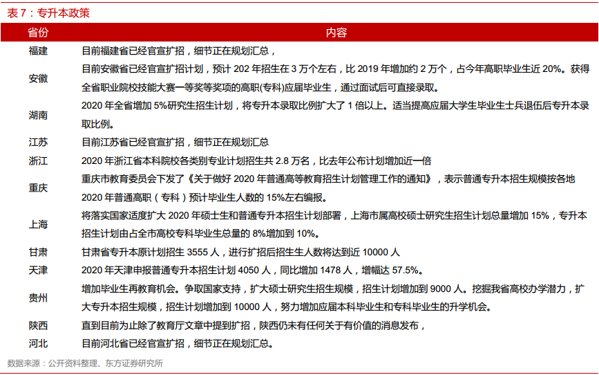 专升本扩张32.2万,高职教育受益显著。教育部副部长翁铁慧在2月28日在会上表示,硕士研究生招生的规模比去年可能会增加18.9万人,同时扩大普通高校专升本的规模,同比争取增加32.2万人,这意味着专升本比例大幅提升。从各地区实际执行情况来看,重庆将专升本录取比例5%提升到15%,上海地区录取比例从8%提升到10%,专升本计划规模显著提升。