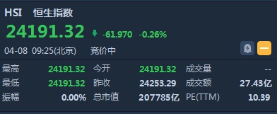 智通财经APP获悉,恒生指数开盘低开61.97点或0.26%,报24191.32点。国企指数跌0.32%,报9815.56点。红筹指数涨0.34%,报3786.5点。大市盘前成交27.44亿港元。
