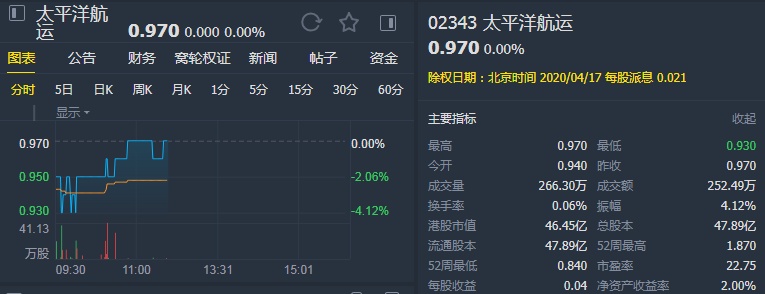 该行认为,太平洋航运现价低于其每股资产净值1.1元,意味着股价下跌空间有限。该行表示,将评级降至“与大市同步”,并预期未来租金收入将下跌,故将今年至2022年每股盈测分别降低58%、14%及11%,目标价维持1.14港元不变。