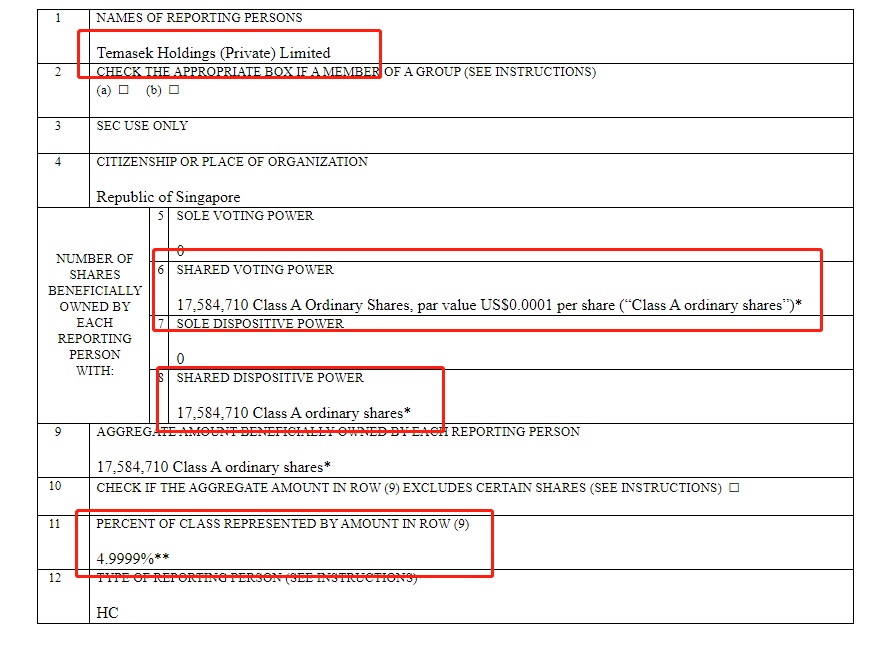 文件显示,截至2020年4月2日,淡马锡控股名下最新持股数为17,584,710股A类普通股(每三股A类普通股等于一股ADS),若以截至2020年2月28日已发行的351,701,837股A类普通股计,其持股比例下降至4.9999%。