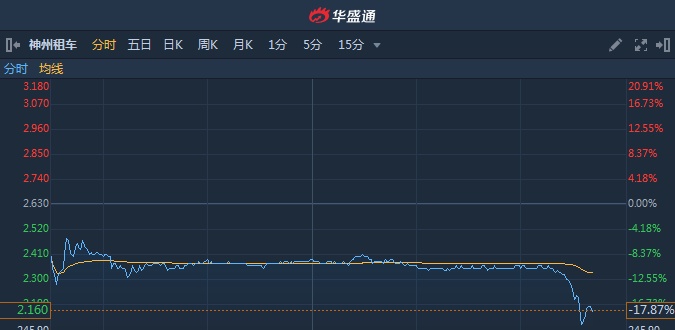 智通财经APP获悉,神州租车(00699)尾盘再度跳水,跌幅一度扩大至20%,截至15时40分,跌17.11%,报价2.18港元,成交额1.704亿。