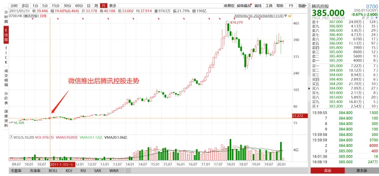 图:微信推出后,腾讯控股股价腾飞 来源WIND