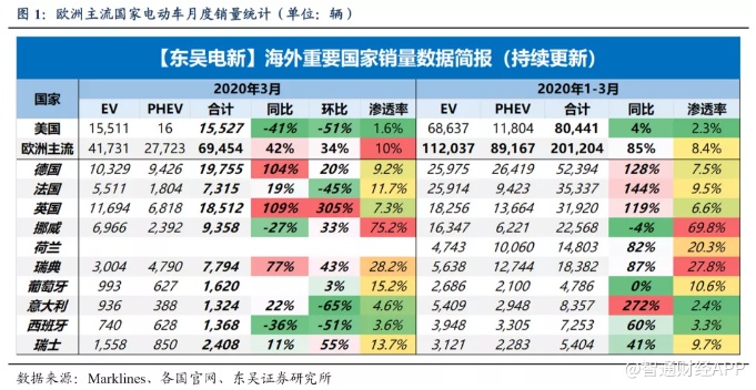 欧洲:3月欧洲电动车逆势增长,英德大超预期。3月欧洲主流国家传统乘用车销量66.7万辆,同环比-58%/-22%,汽车市场受公共卫生事件影响整体受挫,但电动车销量超预期,实现逆势上涨,主要受益于欧洲碳排放考核正式执行,主流国家电动化趋势不减。按主流国家销量统计(荷兰暂缺),3月欧洲新能源汽车共销售6.95万辆,同比增42%,环比增34%,电动车渗透率进一步提升至10%。一季度累计销量20.12万辆,同比增85%,渗透率为8.4%。