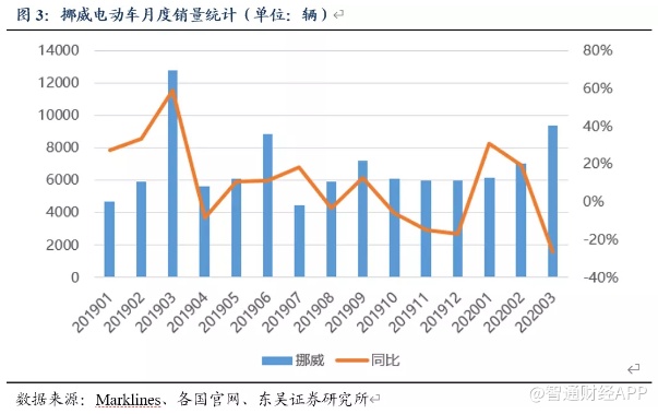 3月欧洲电动车逆势高增长,英国德国销量大超预期。在公共卫生事件影响下欧洲汽车市场整体受挫,3月欧洲主流国家传统乘用车销量66.7万辆,同环比-58%/-22%;但电动车超预期,实现逆势上涨。按主流国家销量统计(荷兰暂缺),3月欧洲新能源汽车共销售6.95万辆,同环比+42%/+34%,其中德国(1.97万辆,+104%)、英国(1.85万辆,+109%)超预期引领增长,共为欧洲贡献55%的销量;挪威(9358辆,-27%)销量居欧洲第三,渗透率进一步提升至75%;瑞典(7794辆,+77%)、瑞士(2408量,+11%)受公共卫生事件影响较小,销量保持增长态势不减;法国(7315辆,+19%)、意大利(1324辆,+22%)、西班牙(1368辆,-36%)属于公共卫生事件严重地区,销量下滑明显。