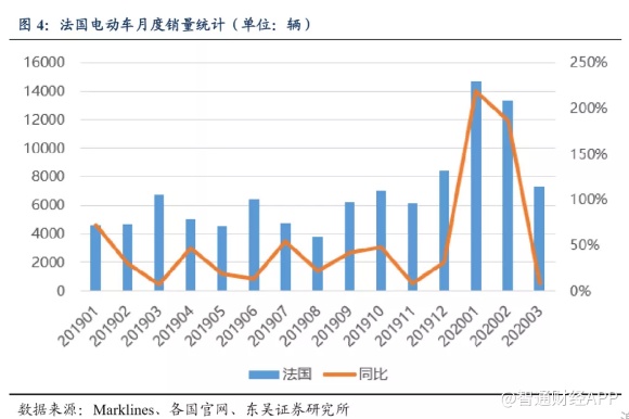 英国季末冲量,叠加补贴退坡车企抢装,3月销量大增,创新高;4月开始汽车征税改革,持续刺激电动车销量。3月电动车销1.85万辆,同环比大增+109%/+305%,单月销量创新高。主要原因:1)季度末冲量;2)英国3月宣布电动车补贴延续到2023年,但单车补贴降500至3000英镑,3月12日执行,补贴退坡抢装明显。而从4月开始,英国将按照碳排放标准WTLP征收汽车税,传统燃油车税率提高,而电动车继续实行零税率;同时4月起,英国私人用公司的电动车所需交付的福利税16%可完全减免,而燃油车的税率在16%以上,因此4月之后汽车征税改革将持续刺激电动车销量。