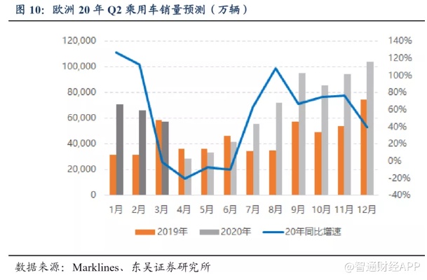 公共卫生事件将阶段性影响欧洲 Q2 销量(环比降 50%), Q3 有望恢复,全年预期下调至 80-90 万辆,增 50-65%。大众、戴姆勒、雷诺、PSA、起亚等均关闭欧洲、美国工厂, 部分车企尚未有清晰的复产规划,我们预计 4 月中旬前复产的难度大,有望 4 月底开始 逐步复产,因此 4-6 月销量将明显受影响。我们预计 4-5 月销量 3 万辆/月,不足 1、2 月的 50%,6 月环比略有改善;Q2 累计 10 万辆,同比下滑近 15%,环比下滑近 50%。后续随着公共卫生事件控制,车企复产及新车型推出,Q3 销量将恢复,且 19 年 7-8 月基数低, 增速将恢复至 1-2 月翻番水平。因此我们预计欧洲 Q1-4 销量分别为 20/10/22/28 万辆, 同比增速 83%/-15%/77%/60%,全年合计 80 万辆,同比增 48%左右。