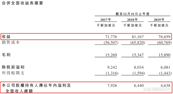 盈利能力不断下滑。2017-2019年,公司收益分别为7177.6万新加坡元(单位下同)、8116.7万元及7665.9万元;毛利率分别为21.3%、18.9%以及20.7%;公司股权持有人应占年内溢利及全面收入总额分别为792.6万元、644万元及463.8万元;纯利率分别为11%、7.9%及6.1%