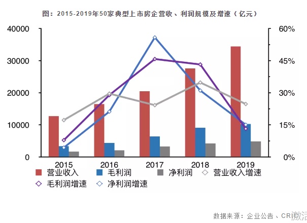 在营业收入和营业成本双重挤压下,毛利规模增速下降趋势更加显著。50家典型上市房企2019年实现总体毛利润10309亿元、归母净利润3746 亿元,分别同比增长13.2%、14.9%,毛利增速较2018年大幅下降30个百分点,归母净利润增速也下降了4.9个百分点。