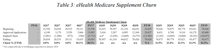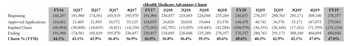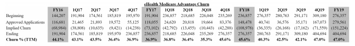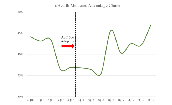 我们认为可以合理的推断易康的新任领导人Messrs. Flanders and Francis在2016年中接手该公司时已经对这一新会计准则有了一定的了解。该公司在2018年起,就开始追求流失率高且无法盈利的会员,为的就是尽量利用这一新会计准则。其目的似乎是为了想让投资者认为易康是像Expedia及Zillow这样的公司。新管理层的第一个整年是2017年。在这一年里,MA(Medicare Advantage保险计划)申请的批准率几乎没有,但会员的流失率相当低。