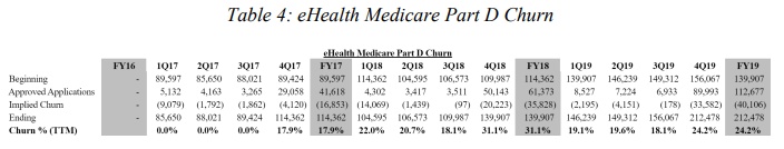 我们认为,易康在2018年和2019年MA申请量的增长是直销广告所带来的无粘性用户。我们的研究表明,在MA方面,有两个人群的流失率特别高,即低收入参保者和因残疾而符合Medicare资格的65岁以下成员。低收入的會員往往會流失,因為一旦他們使用了$0保费的计划,就会转移去下一个不用付费的保险计划。