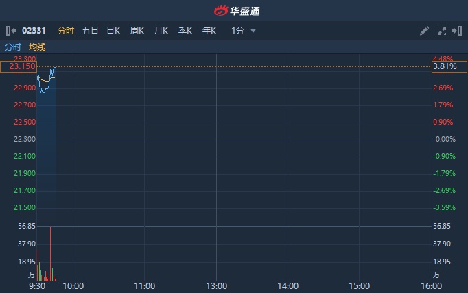 李宁涨3.81%,报23.15港元,成交额1.12亿港元。