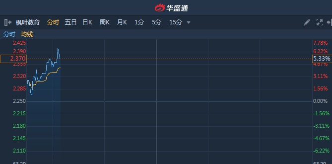 智通财经APP获悉,教育股早盘集体反弹。枫叶教育(01317)入读学生总数同比增加5.3%至约4.36万名学生,消息助力股价上扬,截至10时09分,涨5.33%,报价2.37港元,成交额1083万。
