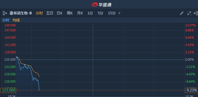 智通财经APP获悉,康希诺生物-B(06185)延续跌势,盘中急挫逾9%,截至10时17分,跌9.23%,报价123港元,成交额1.015亿。