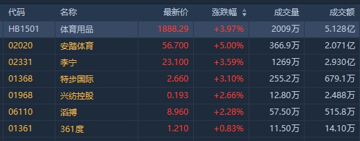 截至发稿,安踏体育涨5.93%,报57.2港元;李宁(02331)涨3.81%,报23.15港元;特步国际(01368)涨3.49%,报2.67港元;滔搏(06110)涨2.28%,报8.96港元。