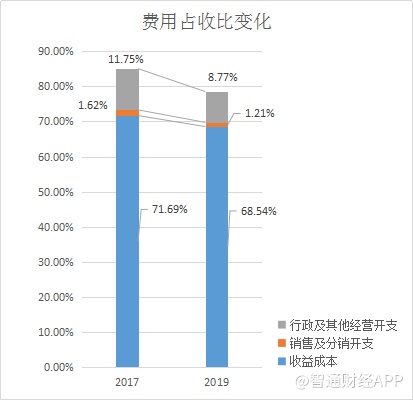 而据智通财经APP了解,公司盈利水平实现快速提升的背后,则离不开公司在成本控制方面所做出的努力。其中,2017年-2019年,公司收入成本占收比由71.69%降至68.54%,销售及分销开支占收比由1.62%降至1.21%,行政及其他经营开支占收比更是由11.75%降至8.77%。