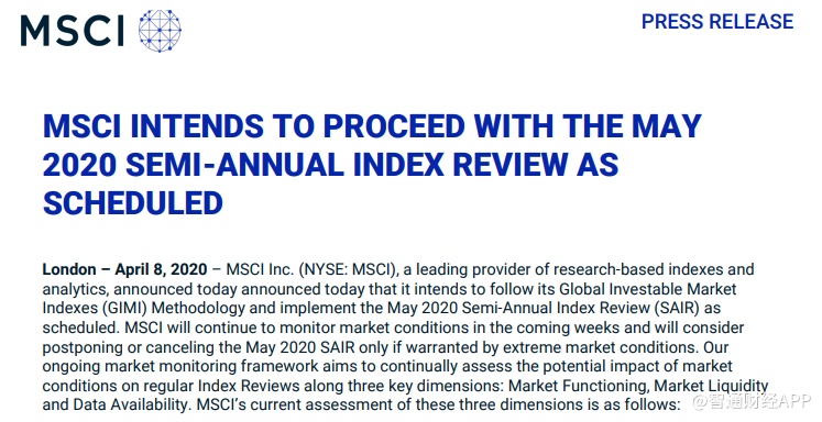 MSCI表示,除非发生极端市场状况,MSCI才会在接下来数周考虑延迟或取消该审议;因为按照MSCI现行监控市场所遵循的市场运行状态,流动性以及数据可获取性三项原则,虽然卫生事件扰动了市场,但全球多数股票市场运行正常,流动性充裕,且数据质量、可获取性均未受到卫生事件影响。