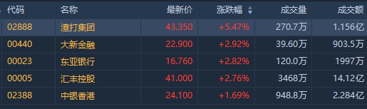 截至发稿,渣打银行(02888)涨5.47%,报43.35港元;东亚银行(00023)涨2.94%,报16.78港元;大新金融(00440)涨2.92%,报22.9港元;汇丰控股(00005)涨2.63%,报40.95港元。