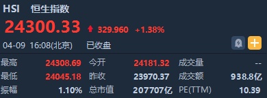 智通财经APP获悉,恒生指数开盘涨0.88%,回收二万四关口。指数全天维持窄幅震荡,尾盘涨幅稍有扩大。截至收盘,恒生指数涨329.96点或1.38%,报24300.33点,全日成交额达938.87亿。国企指数涨1.33%,报9811.12点,红筹指数涨2.2%,报3803.18点。