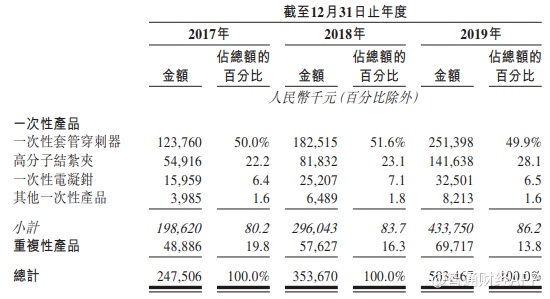 从公司主要销售产品来看,康基医疗也主要以这些细分领域的产品销售为主,其中一次性套管穿刺器收入占比从2017-2019年持续保持50%左右。