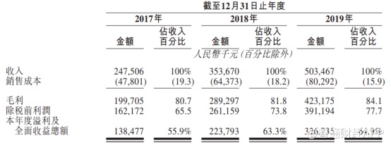 通过在终端渠道的销售,康基医疗获得了可观的收入和利润。智通财经APP了解到,2017-2019年公司营业总收入保持持续高速增长,从2.48亿元(人民币,单位下同)增至5.03亿元,复合增长率达到42.6%;公司同期净利润则从1.38亿元增至3.27亿元,复合增长率达到53.6%。