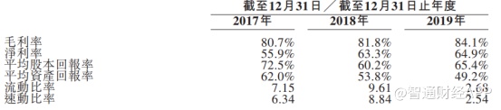 此外,数据显示2017-2019年公司毛利率实现持续增长,从80.7%增至84.1%。通过横向比较发现,三年内行业中可比公司平均主营业务毛利率分别为71.21%、77.06%、75.20%,可见公司在持续高增长的同时,保持着较高的增长质量。
