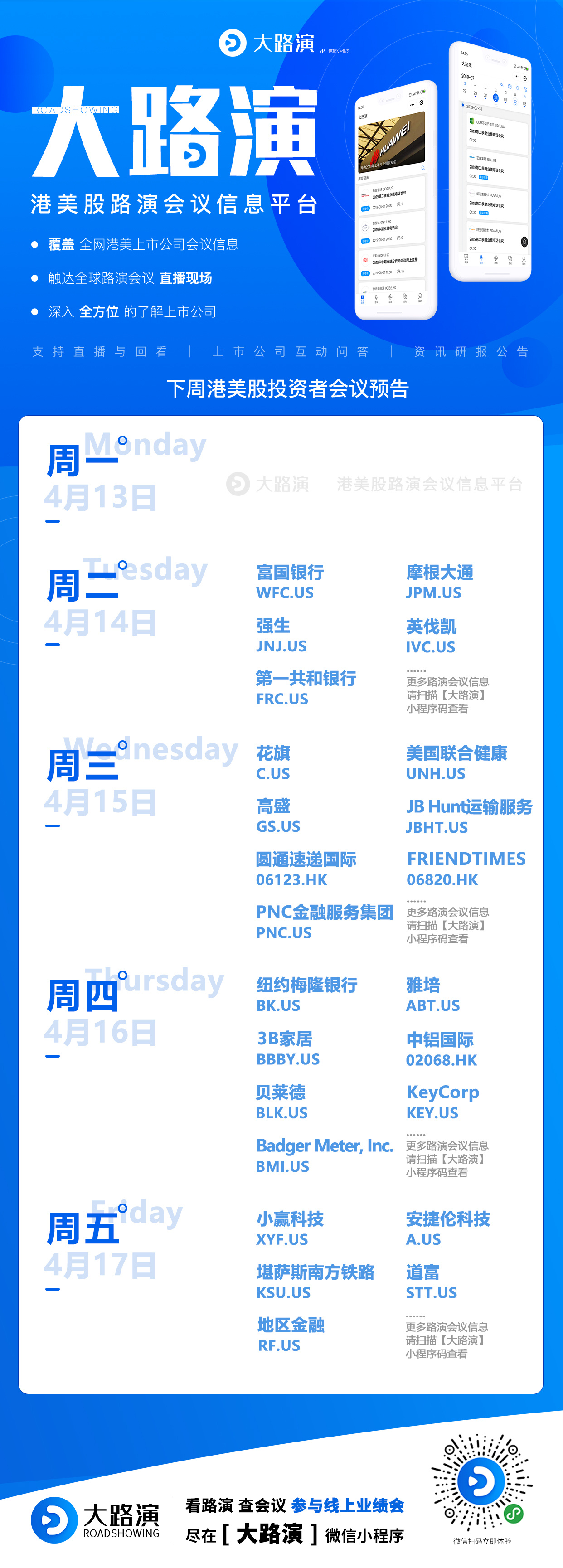 以下是智通财经“大路演”为您整理的下周(4月13日-4月17日)港美股上市公司会议日历。