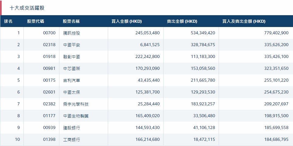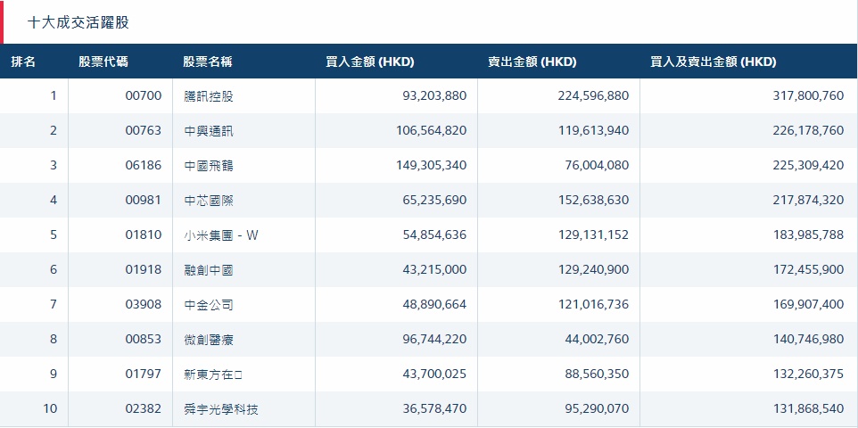 此外,融创中国(01918)获净买入2303万港元,而中兴通讯(00763)、新东方在线(01797)分别遭净卖出1304万、4486万港元。